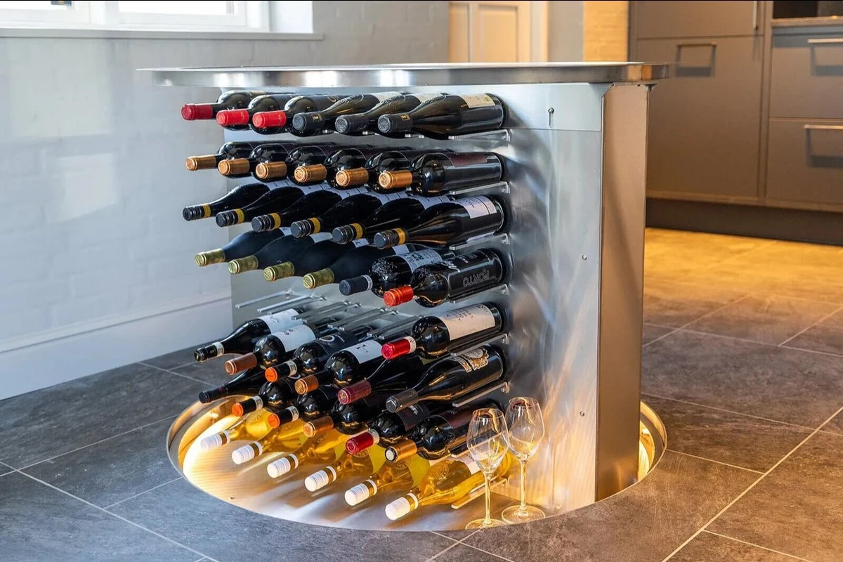 En Vinorage vinkjeller er også et eksklusivt designelement i seg selv. Hver enhet er håndsveiset i rustfritt stål, og utstyrt med en glassluke laget av herdet gulvglass, slik at vinkjelleren kan integreres sømløst i hjemmets gulv. Løsningen kombinerer estetikk og funksjonalitet på en måte som både vinelskere og designentusiaster vil sette pris på.
